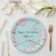 Kirschblüte, Sakura, rosa Blume, türkisfarbene Teller aus Papier. Personalisieren Sie es mit Ihrem Geburtstag und Namen.