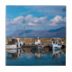 Drei Boote werden durch eine Steinwand am Kissamos alten Hafen auf der Insel von Kreta in Griechenland verankert. Diese See-themenorientierte Keramikfliese ist völlig kundengerecht.