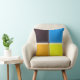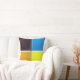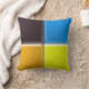 Plätze mit abgeschrägtem 3-D-Look, in Orange, Gelb, Blau und Schwarz, treffen sich in der Mitte des Kissens. Die Rückseite zeigt die gleichen Farben in veränderter Position, um den Farben auf der Vorderseite zu entsprechen.