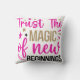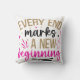 Weißes Kissen mit Beschriftung Jedes Ende markiert einen Neubeginn in schwarz, gold und rosa.