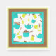 Küchenutensilienmuster mit gelbem Charakter, türkisfarbenen und kräftig braunen Schichten.