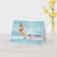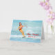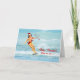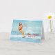 Kitesurfing Weihnachten, Papiergrußkarte. Eine junge Frau Klaus ist, kitesurfing und sagend Sankt, sie abzuholen, nachdem ihr downwinder vorbei ist. Sie ist Weise südlich des Nordpols dieses Jahr. Vintager inspirierter Entwurf einer eine Weihnachtsmannmütze tragenden und kitesurfing Frau. Kunst, Bild und Verscopyright © Shoaff Ballanger Studios.