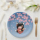 Vector Illustration eines niedlichen orientalischen Mädchens mit schwarzen Fuchsohren und Schwanz in einem roten Kimono Kleid mit breitem Bi-Sash mit einem bemalten Fan. Das schwarze Haar des Mädchens ist mit Blume und geisha-artigen Haarnadeln dekoriert. Kitsune bedeutet Fuchs auf Japanisch. Dieses Kunstwerk wurde von traditionellen japanischen Kokeshi-Puppen inspiriert. Der blühende Sakura-Baum macht einen einfachen Hintergrund.