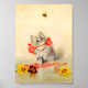 Poster mit Meta Plückebaum Kunstwerk Kitten mit einem roten Band (b. 1876). Ein graues Kätzchen mit dunklen Streifen ist schön mit einem roten Band geschmückt. Das Kätzchen spielt mit einer Biene. Gelbe Blumen schmücken den Vordergrund. Ein wunderbares Geschenk für Katzenliebhaber und deutsche Kunstliebhaber!