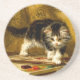 Sandstein Untersetzer mit Henriëtte Ronner-Knip Ölgemälde The Young Artist (1821-1909). Ein Schwarz-Weiß-Kätzchen spielt mit einem Set und zwei Pinseln. Ein wunderbares Geschenk für Katzenliebhaber und Romantiker.