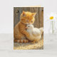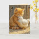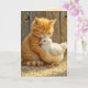 Ein flauschiges orangefarbenes Kätzchen kuppelt sanft ein weißes Küken und schafft einen herzlichen und unerwarteten Moment der Freundschaft in einem rustikalen Holzhausstil, in dem man an Sie denken kann. Text kann geändert werden.