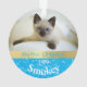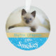 Feiern Sie mit diesem personalisierten Ornament das erste Weihnachtsfest Ihres Kätzchens. Mit einem Hintergrund von Blau mit weißen Schneeflocken und einem goldenen Streifen, fügen Sie einfach Ihren Katzen Namen und das Jahr zusammen mit zwei Fotos oder Ihrem niedlichen kleinen Felsen!