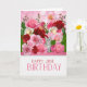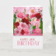 Niedliche Tischkatzenjacke sitzt auf einer rosa und rote Rose Gartenwand auf dieser Geburtstagskarte für den geborenen im Juni.