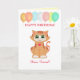 Ginger Kitty Cat Geburtstag wünscht Freundeskarte. Niedliche Katze mit Geburtstagsballons auf weißer Hintergrundkarte. Alle Texte können personalisiert sein.