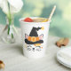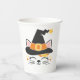 Niedliche Kätzin in einer Hexe hat Papiertassen. Matching-Produkte verfügbar.