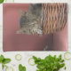 Dieses Küchentuch verfügt über eine hübsche Kätzchen, die in einem Korb nackt.