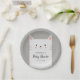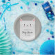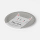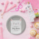 Niedliches Papierteller-Design für Ihr Katzenthema Baby Dusche Party. Illustration eines süßen weißen Kätzchens mit einem Lächeln auf dem Gesicht. Auf ihrem Bauch steht ein Text, in dem steht: "Theresa's Baby Shower 02.02.20XX." Name, Veranstaltungshinweis und Daten sind online leicht editierbar.