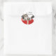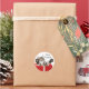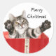 Junge Silbertabby-Katze reicht aus einer roten Geschenkboxen für einen Weihnachtsaufkleber für das Foto