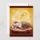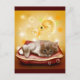 Ein niedliches Kätzchen, das sich auf einem roten Kissen ausruht und von Goldfischen und Blasen über seinem Kopf träumt