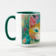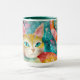 Eine lebendige Katze mit auffallend grünen Augen ist umgeben von einer Vielzahl von bunten Blume und Blättern. Die Szene ist von kühnen und skurrilen Mustern durchdrungen und schafft eine anregende und spielerische Atmosphäre.