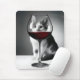 A curious kitten peers through a large glass of red wine, creating an amusing optical illusion. The scene is set against a monochromatic background, highlighting the contrast between the cat and the wine.