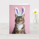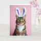 This card features a close-up portrait of a tabby cat with warm brown, black, and cream markings, posed against a smooth rose-pink background 🌷. Soft, fluffy bunny ears sit on its head, white on the outside with a gentle lavender-pink lining that adds a sweet, friendly touch 🐇. The cat’s amber-green eyes meet the viewer in a steady, affectionate way, like it’s sharing a quiet moment with someone it trusts. A bright white chest patch and fine white whiskers stand out clearly, giving the face a tender, well-lit focus. Across the upper portion of the design, “Happy Easter” appears in a simple, rounded font in white, easy to read against the pink. A smaller line of text sits near the bottom in light lavender, centered and spaced neatly beneath the portrait. The overall lighting stays soft and even, smoothing the background while keeping the fur texture detailed. The tiny pink nose sits just above the lower text line, framed by whiskers that fan outward on both sides.