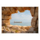 Kizkalesi (Burg Maiden) - eine Burg auf einer kleinen Insel in der Nähe von Mersin an der Südküste der Türkei. Dies ist der Blick durch ein Fenster in den Ruinen der alten Stadt von Corycus auf dem Festland. [Unsere Reisefotos und -designs sind als Geschenke für Zuhause, Karten, Puzzle, Wandkunst und vieles mehr erhältlich]