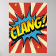 Mit diesem dynamischen Pop Art Poster erwecken Sie die Energie eines Comic-Buchpanels. Das Kunstwerk erzählt eine Geschichte des reinen Einflusses und verwandelt den scharfen Klang von "CLANG!" in ein kraftvolles visuelles Erlebnis. Das Besondere daran ist die Hommage an die ikonische Comic-Kunst, die eine kühne Sternexplosion und strahlende Echoringe aufweist, die die Schallwelle grafisch darstellen. Das klassische Halbtonpunktmuster und die lebhaften, kontrastreichen Farben verleihen dem Werk einen Retro-Charme, der an ein Meisterwerk von Roy Lichtenstein erinnert. Mehr als nur ein Poster, das ist ein Statement-Stück, das einen Moment dramatischen Handelns einfängt. Die perfekte Dekoration für einen Spielsaal, ein Musikstudio oder jeden Raum, der einen kühlen, ikonischen und unvergesslichen Stil braucht.