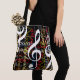 Ein nahtloses und modernes Musikdesign in einem stilvollen Objekt für eine Frau... grafische Noten (Dreifach-Klüfte) mit farbenfrohen Namen, die überall auf der Tasche personalisiert sind