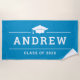 Einfach stilvolles, individuelles Strandtuch mit Abschluss, minimalistischem Typografie-Design mit Gradcap und Streifen Akzenten. Personalisieren Sie den fett weißen, modernen Namenstext für Ihren Absolventen und schließen Sie das Schuljahr ein. Die Farbe des aquamarinen blauen Hintergrunds kann entsprechend den Farben der Schule oder der Abschlussfeier geändert werden. Macht ein einzigartiges Sake-Geschenk für den Absolventen.