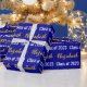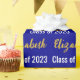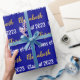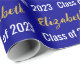 Das Packpapier ist dunkelblau. Es hat ein Textmuster für den Namen und die Klasse des Absolventen 2023. Der Name (Shown: Elizabeth) erscheint in einem eleganten Imitat (nicht Folie) Goldskript. Der andere Text ist weiß. Der gesamte Text kann bearbeitet werden.