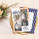 Moderne Klasse von 2023 vier Fotos peach und marineblau Abschluss Ankündigung. Es umfasst vier Fotos des Absolventen auf Farbblöcken von Pfirsich und Marine blau und weiß.