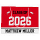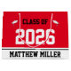 Diese rote, schwarze und weiße Geschenktasche sagt 'Class of 2026' in großem Text. (Sie können das Jahr ändern, wenn Sie es benötigen.) Am unteren Ende ist schwarzer Text, den Sie ändern können, um den richtigen Namen für den Absolventen anzuzeigen. Die Obergrenzen der weißen Absolventen liegen auf beiden Seiten des Satzes "Klasse von".