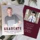 Abschluss-Anzeige mit einem benutzerdefinierten vertikalen Foto auf der Vorderseite und einem kleineren horizontalen Foto auf der Rückseite. Das Wort "Graduate" erscheint in fett bordeauxfarbener Typografie mit einem sportlichen Kollegiatlook ideal für den Studentenathlet, mit dem Namen, der Schule und dem Jahr des Abschlusses unten in Sans Serif Schriftart. Fügen Sie Details über die Leistungen des Absolventen und künftige Pläne auf der Rückseite in weißen Sans Serif Schriftart auf einem burgundy Hintergrund. Eine gute Wahl für High School oder Uni-Abschluss.