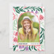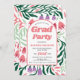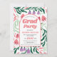 Klasse von 2025 Boho Boho Bogen und bunten Retro Folklore Blume Abschluss Einladung. Dieses einzigartige Design präsentiert einen schönen Boho-Bogen mit anpassbarem Text. Der Hintergrund ist mit Ästen und lebhaften Retro-Folklore-Blume in Korallenpfirsichtönen und Lila lila, mit dunklen und minzgrünen Blätter betont. Der Begriff "Grad Party" wird in fett gedruckter Typografie hervorgehoben. Auf der Rückseite kann ein spezielles Foto des Absolventen in den Bogen aufgenommen werden.