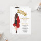 Foto Graduation Party Einladung für die Klasse von 2025. Rote Graduationskappe und Kleid, Frauen Foto Graduation Party Einladung. Graduation Party Einladung weibliches Portrait zeichnend schwarzes Kleid, rote Kappe und Kürbis, lange braune Haare. Goldballons. Fügen Sie das Foto Ihres Absolventen auf die Rückseite.