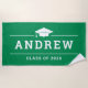 Einfach stilvolles, individuelles Strandtuch mit Abschluss, minimalistischem Typografie-Design mit Gradcap und Streifen Akzenten. Personalisieren Sie den fett weißen, modernen Namenstext für Ihren Absolventen und schließen Sie das Schuljahr ein. Die Farbe des grünen Hintergrunds kann an die Farben der Schule oder der Abschlussfeier angepasst werden. Macht ein einzigartiges Sake-Geschenk für den Absolventen.