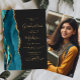Diese trendige 2025 Graduierungsparty lädt mit einem Aquarellbild einer Agile in aquamarinen Blau- und Türkistönen mit Imitats Gold Glitzer Highlights ein. Das Wort "Abschluss" und der Vorname des Absolventen erscheinen in elegantem, goldfarbenem Handschriftzeichen auf schwarzem Hintergrund, zusammen mit den Einzelheiten des Party in Serifen und kursiven Schriftart. Ersetzen Sie das Beispielbild auf der Rückseite einfach durch ein vertikales Foto des Absolventen.