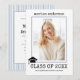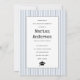 Klasse der 2023 Schreibmaschine staubblaue Streifen Abschluss Foto Einladung. Die Rückseite ist mit einem staubigen blau-weißen Muster mit Streifen versehen.