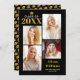 Klasse der 2025 Gold-und Schwarz-Grade-Party Einladung. Es zeigt unsere Fotos, Ihren goldenen Text auf schwarzem Hintergrund und eine Graduierenkappe. Die Rückseite enthält die Details des Party in einem Rahmen mit einem Musterrahmen aus Graduierungskappen.