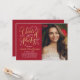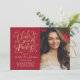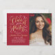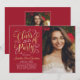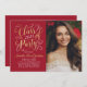 Stilvolle zweiseitige Abschluss-Anzeigenkarte und Party Einladung mit einem Portrait des Absolventen mit angrenzendem eleganten Imitat Goldfolie-Design in Drehbuch mit hübschen Scroll-Akzenten. An der Kartenvorderseite ist auch der in Gold und Weiß übergebene Text enthalten, der für die Veranstaltung personalisiert werden kann. Auf der Kartenrückseite wird der Abschluss mit einem zweiten Foto und einem benutzerdefinierten Text für den Namen des Absolventen, das Schuljahr und die Schule angekündigt. Die tiefrote Hintergrundfarbe kann so geändert werden, dass sie mit den Foto- oder Party-Farben koordiniert wird. Foto Tipp: schneiden Sie Ihr zweites Foto in ein quadratisches Format, bevor Sie auf die Website hochladen.