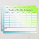 Diese preisgünstige 2-in-1-wöchige Vorlage ist in 6 Zeilen und 6 Spalten unterteilt (zuerst TIME, gefolgt von Wochentagen MON bis FRI), und eine große rechteckige Form für zusätzliche Notizen auf beiden Seiten. Ein einfacher moderner Gradientenhintergrund in Blau, Weiß und Grün macht ihn zu einem perfekten Fahrplan für Schüler aller Altersgruppen und Geschlechter. Personalisieren Sie es mit Ihrem eigenen Namen oder Titel auf der Vorder- und Rückseite.