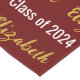 Der Tischläufer ist dunkelrot. Es hat ein Textmuster für den Namen und die Klasse des Absolventen 2024. Der Name (Shown: Elizabeth) erscheint in einem eleganten Imitat (nicht Folie) Goldskript. Der andere Text ist weiß. Der gesamte Text kann bearbeitet werden.