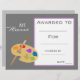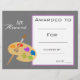 Eine stilvolle Auszeichnung der modernen Klasse mit einem niedlichen Pinsel mit Farbbild, der perfekt geeignet ist, einen jungen Kunststudenten zu ermutigen. Sie können in Ihre eigenen Details schreiben. Eine großartige Ressource für jede Art von Klassenlehrer.