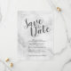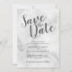 Classy Elegant White Marble Wedding Invitation Suite : Save the Date Karte mit dem Titel in grauem, modernem Script Schriftart mit Hochzeitsdetails in grauem, modernem Sans Serif Schriftart auf weißem Marmorboden.