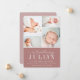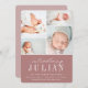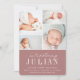Elegante Geburtsankündigungen zeigen vier neu geborene Fotos, die in einer Gittercollage auf einem staubigen Rose-mauve-Hintergrund angeordnet sind. Unter "Einführung [Name]" wird in schicken Kalligraphieskripten und klassischen Blockbuchstaben "eingeführt". Personalisieren Sie das Baby mit dem vollständigen Namen, den Geburtsstatistiken und einer Familiensignatur unten.