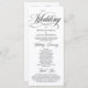 Elegantes Vintages Schwarzes Drehbuch, Hochzeitsfeierprogramm in Karte (lang). Es ist mit Scrollakzent entworfen, der personalisiert werden kann mit benutzerdefiniertem/personalisiertem Text für Ihr Brautparty, Zeremonie Details, Gedenkhinweise und Dankeschön-Nachricht.