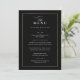 Dieses klassische, elegante Hochzeitsmenü ist einfach und vielseitig. Das Design ist schick, weiß und schwarz, mit einem Monogramm, Skriptdetails, einem einfachen Goldrahmen und formalem bearbeitbarem Text. Klicken Sie auf die Schaltfläche Bearbeiten, um dieses Design anzupassen.