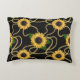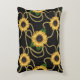 Ein Kissen mit einem eleganten und stilvollen Muster. Hübsche gelbe Sonnenblumen und grüne Blätter umgeben von zarten Goldketten. Schwarzer Hintergrund.