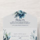 Diese klassische Aquarellblütenhochzeit in einer Einladung ist perfekt für eine rustikale Hochzeit. Das Design ist mit handbemalten, wasserfarbenen blauen Blumen und gut zusammengesetztem Blattwerk in einem hübschen Bouquet gestaltet. Rett Papier, indem mehr Details in die Einladung aufgenommen werden anstatt auf einer separaten Gehäusekarte.