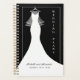 Klassische Hochzeitsplaner-Agenda mit kugelgegossenem Kleiderabdruck. Personalisierter wöchentlicher/monatlicher Terminkalender für Spiralplaner. Machen Sie Ihr eigenes elegantes Cover-Design mit Namen von Braut und Bräutigam plus Heiratsdatum. Eine Geschenkidee für zukünftige Brautpaare, um ihre Hochzeit besser planen zu können. Ideal für die Planung von Veranstaltungen, Veranstaltungsorten, Blume, Deko.. Goldene Spiralringe mit niedlichem Schwarz-Weiß-Design von Kleidung und Schleier, die an einem Kleiderbügel hängen. Stilvolle Schrift-Typografie-Vorlage.