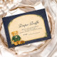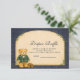 Ein charmantes, vornehmes Baby-Shower-Design mit einem süßen Teddybären, der eine klassische grüne Karo-Jacke und eine Fliege trägt. Über dem Bären zeigt eine zarte Wäscheleine winzige Babykleidung und Schuhe und schafft eine nostalgische Szene aus einem Bilderbuch-Kinderzimmer. Der dunkelblaue Hintergrund und der dezent karierte Rahmen verleihen dem Ganzen eine raffinierte, vintage-inspirierte Note, die sich sowohl elegant als auch verspielt anfühlt. Perfekt für eine stilvolle Baby-Shower-Feier mit klassischer, vornehmer Ästhetik.