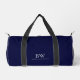 Diese stilvolle, moderne personalisierte Duffeltasche verfügt über ein klassisches Serifenmonogramm und sans serif name in weiß auf einem marineblauen Hintergrund.