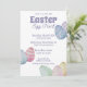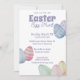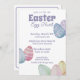 Diese individuelle Einladung beinhaltet ein klassisches Thema der Ostereisjagd und des Brunch. Die Ostereier sind in verschiedenen Pastellfarben dekoriert, und die Kanten sind Vintag. Die Veranstaltungsinformationen werden in einem skurrilen lila Schriftart gedruckt.