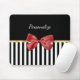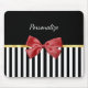 Ein elegantes Mousepad mit senkrechten, schwarz-weißen Streifen, geschmückt mit einem schicken IMITAT goldfarbenen Streifen und einem Bild eines klassischen roten Bändchenbogens. Personalisieren Sie es, indem Sie den Namen des speziellen Mädchens in Ihrem Leben hinzufügen. Flachdruckbild, NICHT metallisch oder tatsächlicher Bogen.